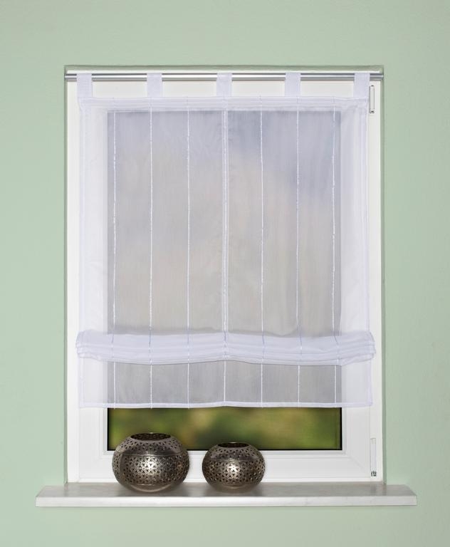 roleta z průhledného voálu zavěšená na poutkách s efektními zvislými proužky